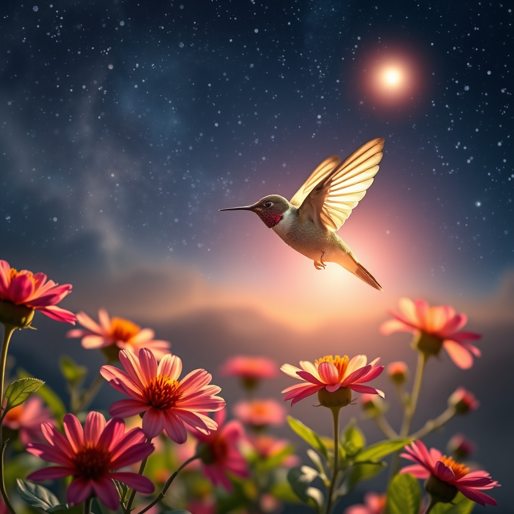 A vivid scene of a hummingbird gracefully flitting among cosmic flowers, illuminated by the radiant glow of a distant sun, set against a backdrop of a star-spangled sky, capturing the harmony between delicate nature and the vast expanse of space in stunning 4k detail.