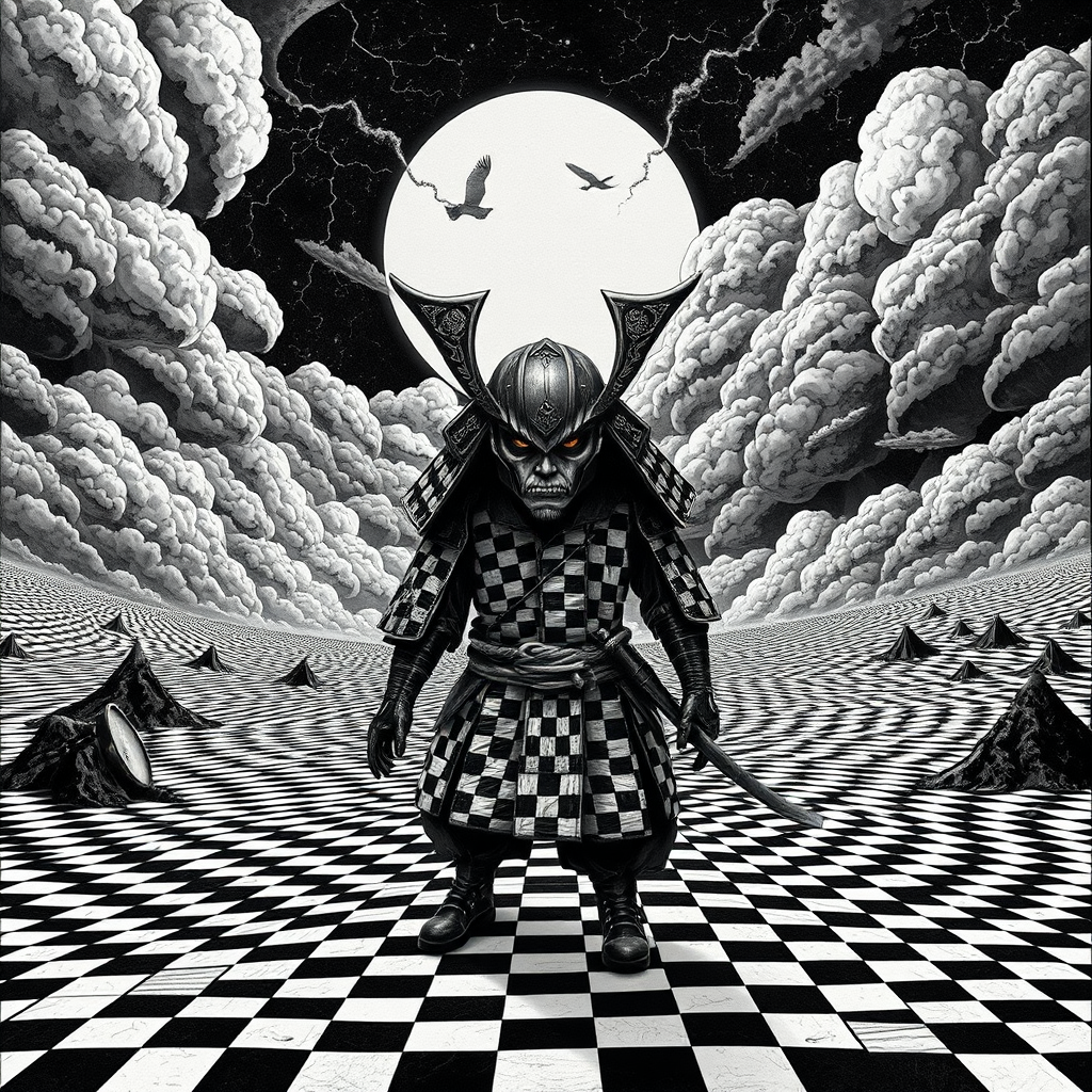 A vivid scene of a nuclear samurai, eyes wild with schizophrenia, stands amidst a tesselated landscape. The atmosphere crackles with a sense of impending doom, an omen articulated through the manipulation of AI—a checkerboard of op art patterns stretches into the horizon, cascading in a hypnotic play of black and white. This surreal tapestry weaves chaos with precision, each facet reflecting the inner turmoil of the warrior, as Jean Leon Gerome’s historical touch meets futuristic vision.