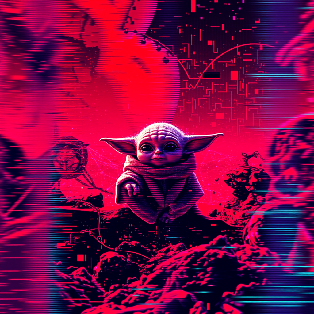 A vivid scene of heavy digital distortion emerges, drenched in glitch art aesthetics with oversaturated reds and purples dominating the view. The corrupted data visualization creates a chaotic tapestry of pixelation artifacts, while analog interference patterns ripple through the scene. Chromatic aberration adds a layer of surrealism, reminiscent of VHS distortion, as if the image is caught in a digital decay. Subtle wavelight interference patterns dance across the surface, and amidst this organized chaos, a hint of baby Yoda emerges, blending into the vibrant, glitch-filled landscape.