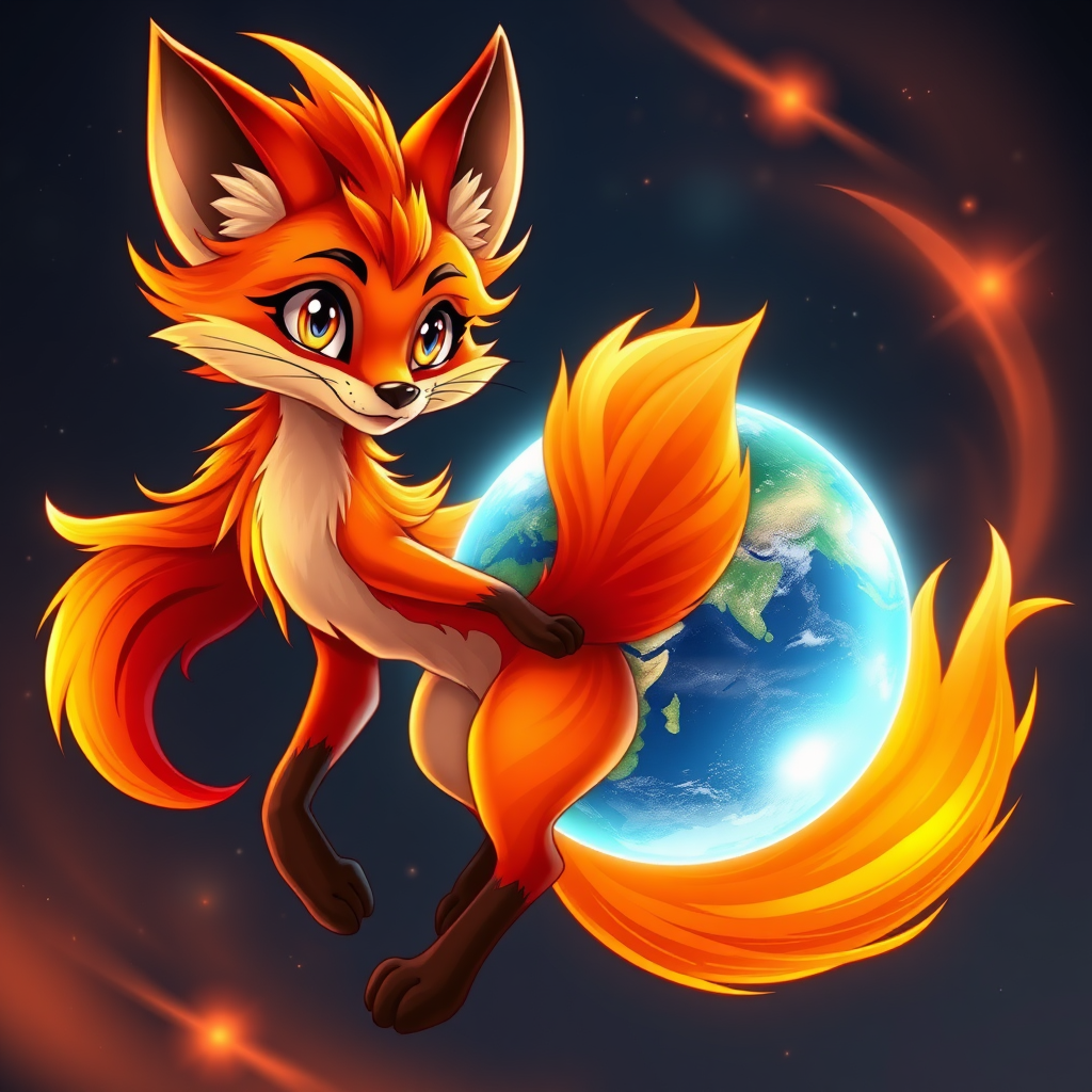 A vividly animated fox, its fiery orange and red fur resembling swirling flames, with distinct gradients capturing the essence of a vibrant sunset. Its eyes are bright and intelligent, reflecting the night sky, full of stars. The fox appears agile and curious, with a sleek, bushy tail wrapping around a glowing, ethereal globe representing the Earth. Its movements are graceful and fluid, as if itβs dancing in harmony with the wind, embodying both the primal spirit of the wild and the modern energy of the digital world. The fox's presence exudes warmth and enthusiasm, inviting exploration and discovery.