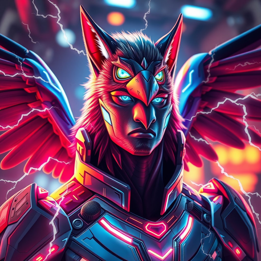 A vividly colored, masterfully drawn gay male protogen fursona featuring a thunderbird with electrifying lightning wings. The scene captures a dramatic, cinematic feel with intense lighting, glow effects, and a cyberpunk headshot. Set against a sci-fi background that highlights mecha elements in sharp focus, the image boasts a striking bokeh effect and vivid colors. Rendered in an impressive 16k UHD, HDR10 resolution with absurd detail, fitting the model Lyriel v. 1.5, it immerses the viewer in a vibrant, futuristic world.