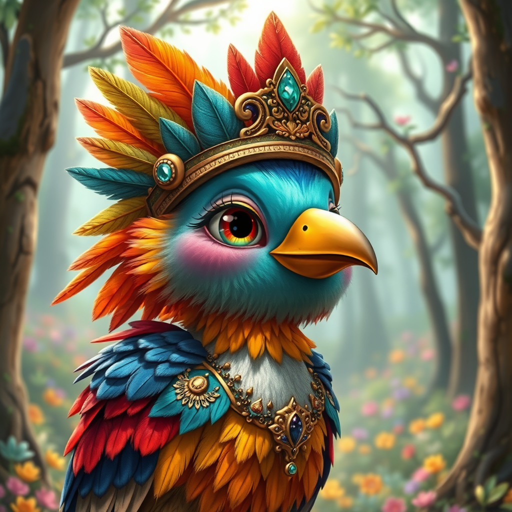 A vividly colorful bird adorned in a feathered crown, eyes gleaming with a playful glint, sporting a tribal-inspired helm and ornate embellishments, as if crafted by an animation studio with the whimsical touch of Quentin Blake. It is clad in delicate armor fashioned from feathers, gracefully moving through an enchanted woodland full of magical trees, with a captivating nature backdrop.