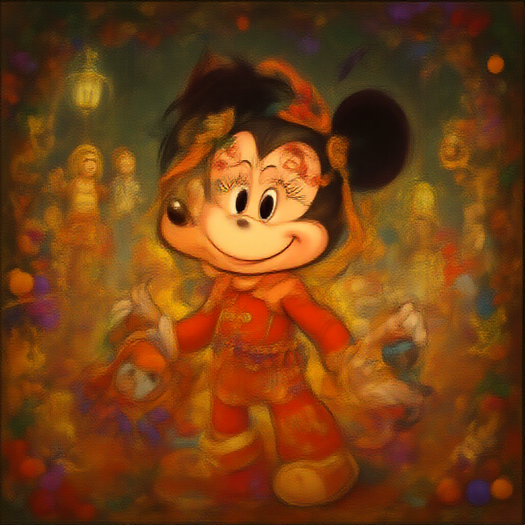 A vividly colorful painting of Mickey Mouse adorned with intricate Catrina makeup, set in the enchanting style of classic Disney animation, featuring ultra-high-definition 32k resolution with detailed character caricatures and mysterious, dreamlike backdrops. The lively tableau illustrates a festive atmosphere, with a sense of whimsical mystery. The proportions are slightly extended to 4:5 aspect ratio for a more dramatic effect. The scene is imbued with a lively spirit and culturally vibrant details, capturing both the playful essence of Disney and the rich tradition of the Catrina in an imaginative and harmonious blend.