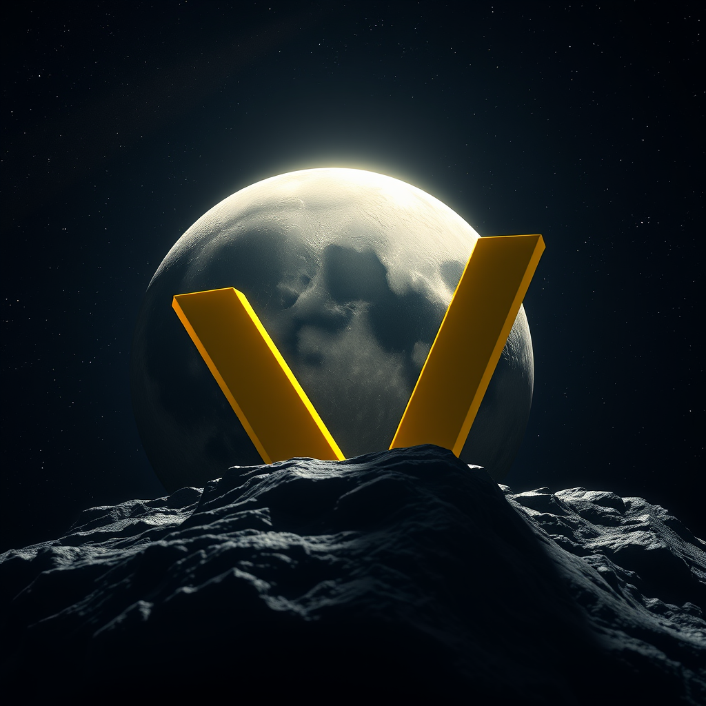 A vividly detailed 3D render of a yellow letter V poised majestically on the lunar surface, against a backdrop of the cosmos. Bathed in cinematic lighting, the letter exudes an ultra-realistic texture, casting intricate shadows on the moon's rugged terrain. Stars twinkle in the vast expanse of space, highlighting the high-detail composition, where the curvature of the moon and the ethereal glow of distant celestial bodies create a mesmerizing scene.