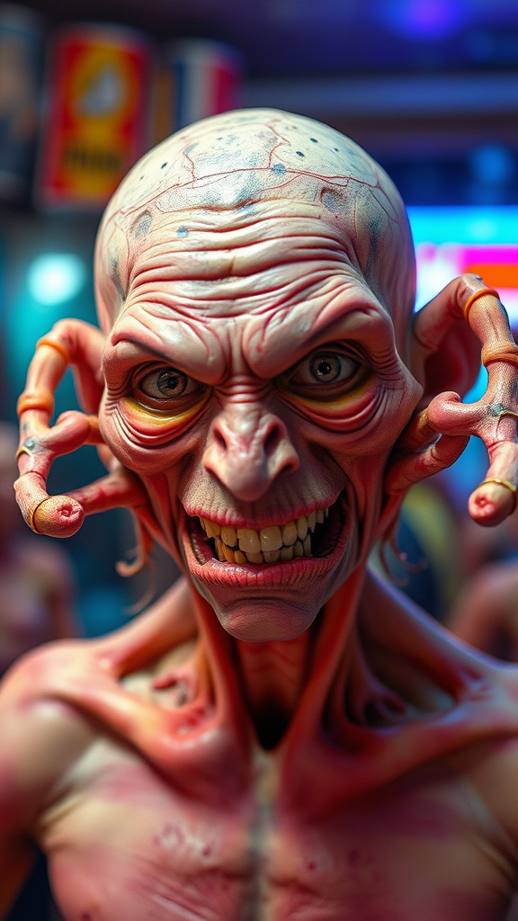 A vividly detailed color photograph with professional, realistic attributes featuring photorealistic elements and cinematic lighting. The image showcases hyperrealistic textures with raytracing effects and depth of field, capturing the essence of AD Magazine Photography. The subject appears distorted, with poorly proportioned anatomy, including extra limbs, missing or floating disconnected limbs, and unusual mutations. The scene is filled with vibrant colors yet has an unsettling air due to the ugly, grotesque, and blurry portrayal, reminiscent of an unsettling artistic experiment.