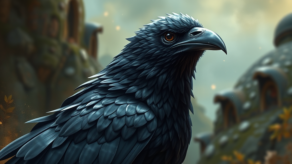 A vividly detailed depiction of a Kenku crow, intricately crafted in a miniature style for a Dungeons and Dragons game; the artwork captures the essence of the creatures' avian features with sharp focus on its glossy feathers and cunning eyes, set against a backdrop that suggests a mysterious and adventurous setting.