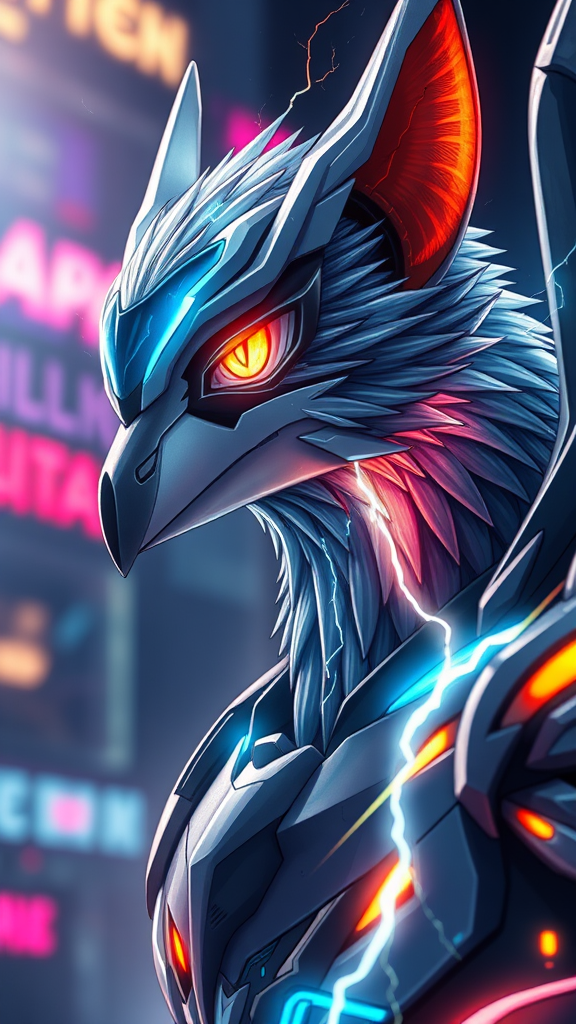 A vividly detailed illustration captures a gay male protogen fursona, embodying the essence of a masterfully drawn thunderbird with dynamic lightning wings, set against a cyberpunk-themed backdrop. The headshot reveals intricate details, enhanced by dramatic and cinematic lighting that accentuates the glow effects. The scene unfolds within a sci-fi setting, showcasing mecha influences and sharp focus. The bokeh effect adds depth, emphasizing the vivid colors that burst with life, all rendered in ultra-high definition, HDR10 support, and absurd resolution, inspired by Model: Lyriel v. 1.5. A fusion of imagination and reality, maintaining an electrifying and awe-inspiring presence.