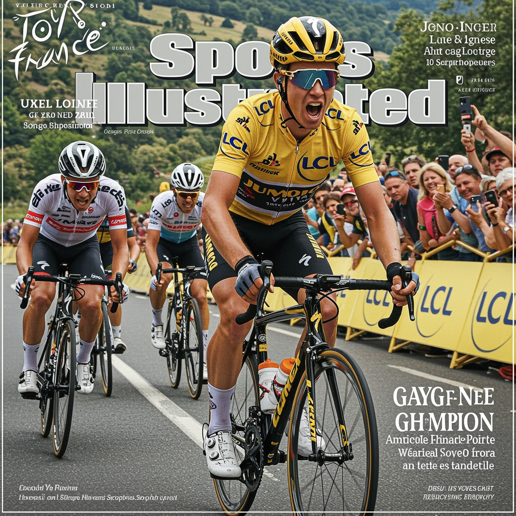 A vividly detailed illustration of a Sports Illustrated cover featuring the Tour de France champion in the iconic Yellow Jersey, capturing the intense energy of elite competition, photorealistic style, showcasing dynamic motion and the cyclist's determined expression against a breathtaking backdrop of the French countryside, incorporating subtle creative elements like a dramatic play of sunlight and shadow, and the vibrant colors of the peloton in the distance, all while maintaining the essence of a high-stakes, world-class athletic event.