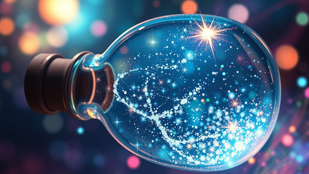 A vividly detailed painting of delicate magical fairy dust swirling inside a mystical bottle, emitting an aura of cosmic energy. The artwork features deep, contrasting colors that blend seamlessly with fantastical elements, creating a sense of wonder. Perfect as a concept piece for Artstation with influences from Unreal Engine 5, the piece embodies the aesthetic of Japanese Manga and anime key visuals, showcasing hyperrealistic textures and dramatic lighting. The composition focuses on a mid-shot, capturing an intricately detailed scene with a 2/3 face angle, illuminated by side lighting against a colorful, immersive background. Styled akin to Pixiv and Zerochan artworks, the piece exudes a unique blend of anime art and splash art influences, enhanced by a depth of color and meticulous details, reminiscent of a Hyperrealistic, SAI Pixel Art masterpiece.
