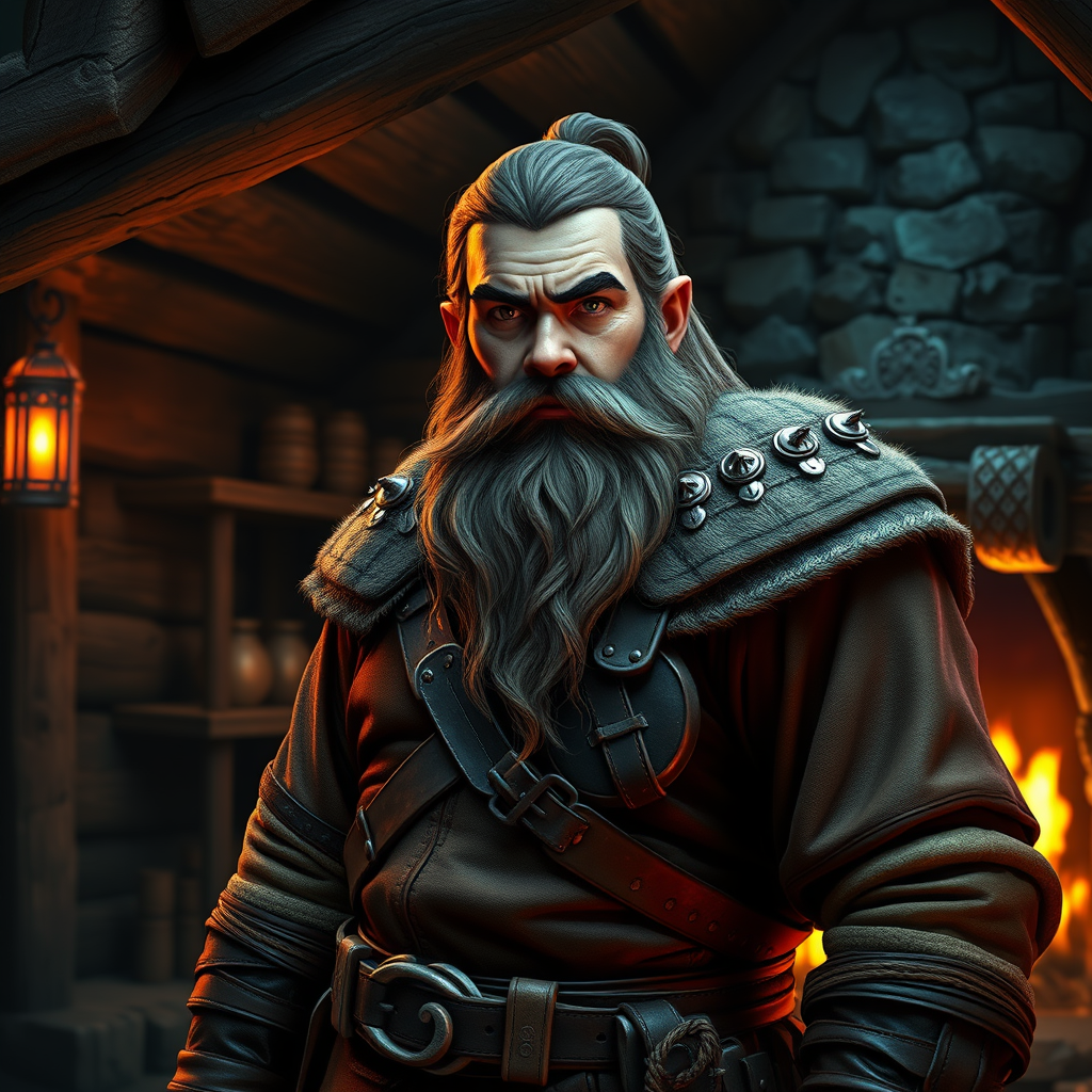 A vividly detailed portrait of a male dwarf adventurer from a fantasy realm, donning intricate leather and cloth armor. He stands confidently within a charming stone cabin, his full beard catching the ambient glow of the fireplace. The scene exudes a rich fantasy ambiance, reminiscent of a night-time medieval setting explored in tabletop RPGs like D&D and Pathfinder. This character's personality radiates through his determined gaze and strong stance. Art reminiscent of Ralph Horsley, blending elements of D&D character design and LOTR fantasy aesthetics. Captured with hyper-realistic detail, the environment and character come alive using advanced techniques like global illumination and ray tracing in Unreal Engine 5. The artwork is polished to present a high-definition finish that would trend on platforms like ArtStation and DevianArt, emphasizing fantastical realism and craftsmanship.