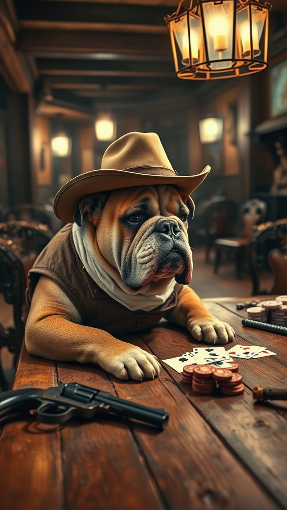 A vividly detailed portrait of an English bulldog engrossed in a game of poker inside a classic western saloon, bathed in the warm glow of dimly lit lanterns. The bulldog, wearing a weathered cowboy hat, stares intently at its hand of cards, with a rugged leather vest adorning its stout frame. The wooden table is scattered with poker chips and playing cards, while vintage revolvers rest casually nearby. In the background, dusty wooden floors and ornately carved chairs evoke the authentic ambiance of the Old West. Captured with a Fujifilm XT3, the image boasts 8k UHD quality, rich textures, and vibrant colors, showcasing the scene with the clarity and depth of a RAW photo.