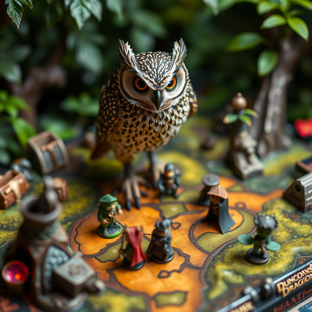 A vividly detailed scene featuring a miniature owl perched on a small forest-themed Dungeons & Dragons game board, its feathers intricately detailed, eyes sharp and focused, as it watches over the tiny figurines engaged in an epic quest. Lush foliage and mystical artifacts dot the landscape, creating a captivating, high-detail fantasy environment in a 3:4 ratio.