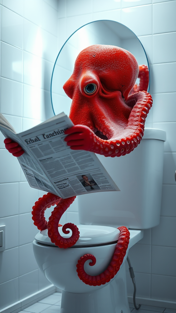 A vividly detailed scene featuring a red octopus perched on a toilet, engrossed in reading a newspaper. The setting is bathed in white tones, with white walls and a mirror positioned behind the octopus. The ambiance is enhanced by LED and glow lights, creating a hyper-realistic and cinematic atmosphere with highly detailed textures. The octopus's skin is intricately detailed, and the reflection in the mirror adds depth, while the overall lighting remains bright and luminous without any dark tones.