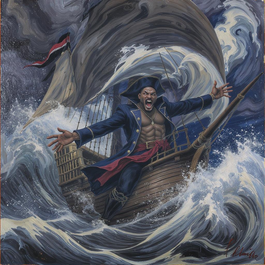 A vividly expressive scene unfolds on a turbulent pirate ship cutting through stormy high seas, where an angry Will Smith passionately gesticulates amid the chaos. The color palette swirls with deep porpoise blues and flint greys, interspersed with fossil tones, as charcoal waves crash against the white-capped swells. In a Fauvist and Expressionist style, exaggerated forms and bold strokes capture the intensity of emotions and the dynamic energy of the oceanic setting.