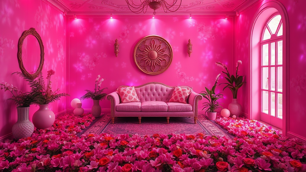 A vividly illuminated pink room with an enchanting ambiance, featuring a cozy couch and an intricate rug, suffused with a dreamy and magical atmosphere. The walls shimmer with fantastically gaudy pink hues, creating a serene zen-inspired space that feels both whimsical and dramatic. The room is adorned with a bed of vibrant flowers on the floor, adding to the enticing floral environment. The beautiful and aesthetic design of the space enhances its enchanting allure, blending magical colors to craft an otherworldly, fantastical retreat.