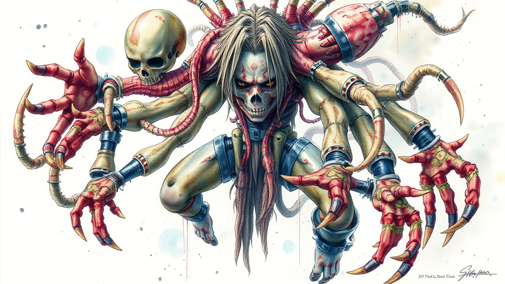 A vividly intricate portrayal of Squall Lionhart from Final Fantasy VIII, reimagined with a surreal twist. Featuring an H. R. Giger-inspired design, the character boasts multiple legs, multiple heads, and an array of arms, each adorned with an excess of fingers, some distorted and twisted. This watercolor rendition captures the essence of a fragmented existence, with severed bodies and intentionally flawed anatomy. The hands and legs appear distorted, as if caught in a moment of transformation. The scene is imbued with an ethereal quality, marked by low resolution and peculiar textural errors, such as missing fingers, extra or fewer digits, and a blurred ambiance suggestive of jpeg artifacts. A sense of chaos pervades the composition, obscuring details like signature, watermark, and artist name, resulting in a dreamlike depiction that's both mesmerizing and unsettling.