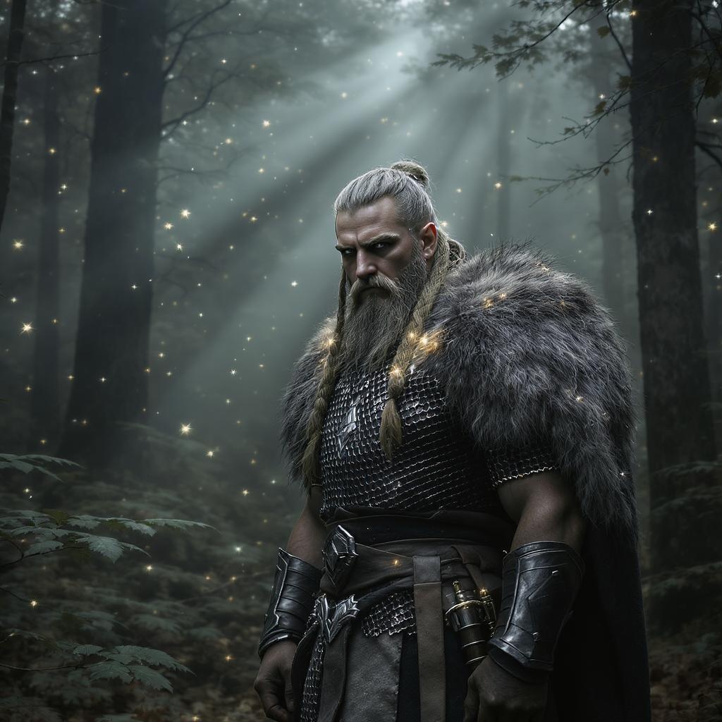 A vividly lifelike scene of a Viking warrior standing proudly amidst a misty forest, the intricate details of his armor and the textures of his braided hair highlighted by ethereal fairy lighting. Soft volumetric rays filter through the dense canopy above, casting a mystical glow on the forest floor. The atmosphere is captured with high dynamic range, bringing every element into sharp focus, while a gentle breeze rustles the leaves, adding a sense of motion and life to the image. The perspective is elongated to capture the towering trees and expansive surroundings in a cinematic 9:16 aspect ratio.