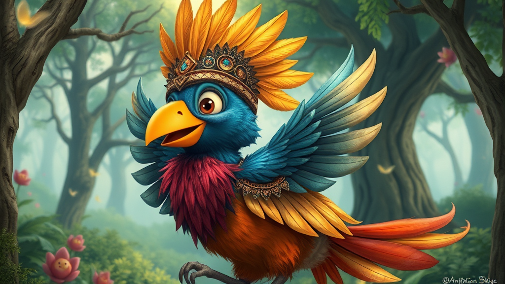 A vividly plumaged bird with a feathered headdress, twinkling eyes, and a playful grin, adorned in a tribal-inspired helmet and elaborate embellishments, envisioned by an Animation Studio and reminiscent of Quentin Blake's style, donning delicate feather armor. It dances gracefully in an enchanted forest, surrounded by magical trees and a lush, natural backdrop.