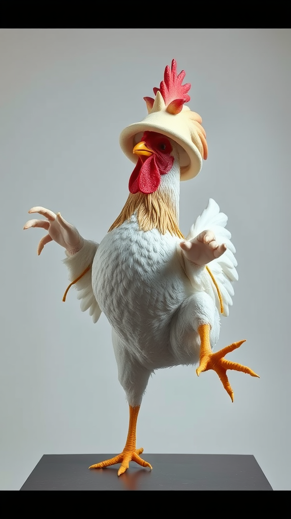 A vividly realistic sculpture of a chicken wearing a comically oversized chicken hat, depicted in a dynamic pose reminiscent of Lois Greenfield’s dance photography. The scene is captured as if in time-lapse, showcasing fluid motion and grace. The artistry echoes Xu Beihong’s attention to anatomical detail, paired with the soft, naturalistic coloration typical of Frank Weston Benson’s works. The sculpture exudes a playful wit akin to clever cartoons, blending humor with an ultra-realistic visual style in a 45:56 aspect ratio.