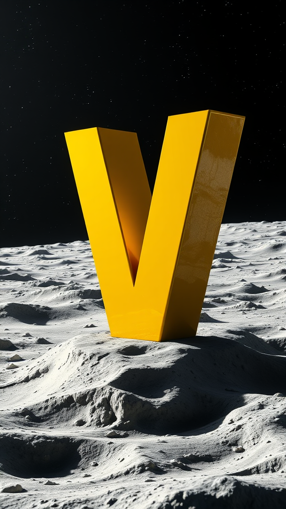 A vividly yellow letter V majestically stands on the moon's surface, surrounded by the vastness of space. The scene captures an ultra-realistic 3D render with cinematic lighting that highlights every intricate detail, from the fine textures of the lunar soil to the subtle play of reflections on the V's polished surface. Stars and distant galaxies serve as a breathtaking backdrop, enhancing the sense of cosmic wonder in this high-detail composition.