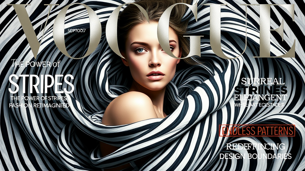 A VOGUE magazine cover features an enchanting woman enveloped in a whirlwind of stripes, her form seamlessly merging with the dynamic, surreal pattern. The twisting lines cascade around her, creating an illusion of movement, while her serene face is partially obscured by the hypnotic waves, giving her an ethereal and otherworldly aura. The bold VOGUE logo shines majestically at the top, its metallic sheen contrasting with the abstract design. Cover highlights boast: "The Power of Stripes: Fashion Reimagined," "Surreal Elegance: Where Art Intersects Style," and "Endless Patterns: Redefining Design Boundaries."