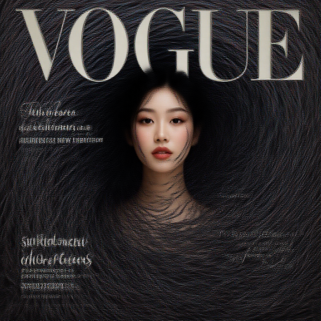 A VOGUE magazine cover showcases an enchanting Chinese woman enveloped in a mesmerizing vortex of swirling stripes. The lines gracefully twist and spiral around her, blending her figure seamlessly into the dynamic and surreal pattern. Her face remains serene, partly concealed within the hypnotic flow of stripes, imparting an ethereal, otherworldly aura. The VOGUE logo, bold and metallic, stands out at the top against the abstract design. Cover highlights feature "The Power of Stripes: Fashion's Daring New Direction," "Surreal Glamour: Where Art and Fashion Collide," and "Infinite Patterns: Redefining Design Boundaries."