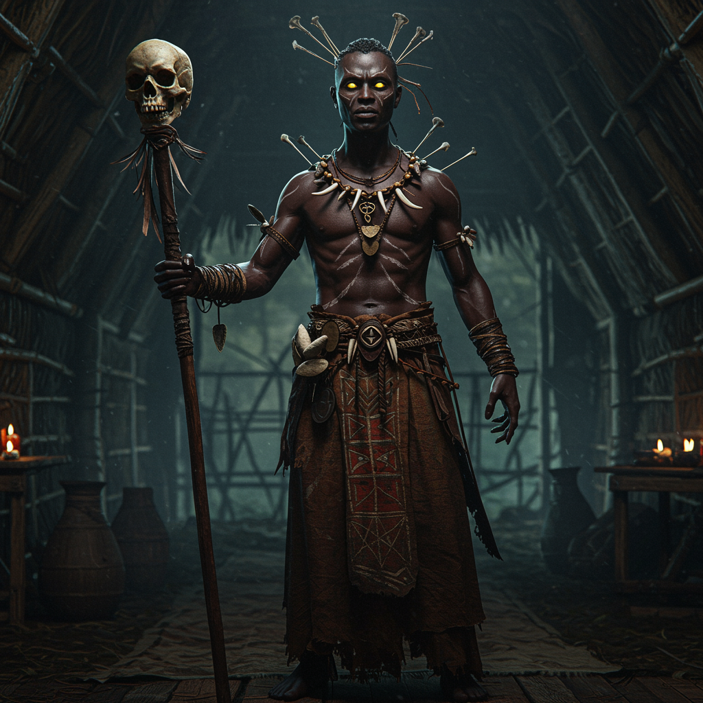 A voodoo priest stands in a dimly lit, atmospheric hut, possessing a rich dark complexion and piercing yellow eyes that seem to glow with an otherworldly presence. His symmetrical and eerily captivating features are accentuated by the shadows, and he faces the camera with an air of enigmatic authority. His body is perfectly proportioned, with limbs and fingers that echo a sense of controlled power. He is adorned in an exquisitely detailed voodoo dress, layers of intricate patterns swirling with mystical symbols, accentuated by an array of voodoo accessories that clink softly as he moves. In one hand, he holds a staff topped with a menacing skull, its hollow eyes echoing his own intense gaze. The ultra-realistic setting captures the finest details, resembling a cinematic shot with movie-quality clarity rendered in octane. The waist-length body shot showcases his presence with precision, employing advanced photography lighting to enhance the dark, brooding atmosphere, while maintaining an 8k resolution for unmatched sharpness. Realistic shadows and depth of field add to the scene's authenticity, complemented by VFX post-production and RTX ray tracing lighting, culminating in an evocative and unforgettable visual narrative.