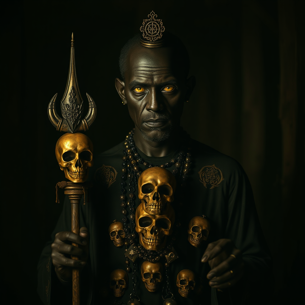 A voodoo priest stands in a dimly lit hut, his dark complexion contrasting with his mesmerizing yellow eyes. His symmetrical, yet unsettling features are striking against the shadowy backdrop. He faces the camera, with proportioned face features and a well-composed physique. His attire is a finely detailed voodoo dress, adorned with skull motifs and mystical symbols. In one hand, he holds a staff crowned with a skull, surrounded by intricate voodoo accessories. The details in his dress and staff are ultra-realistic, showcasing the highest quality, as if part of a cinematic masterpiece. The scene is captured from a waist-length perspective, with photography lighting enhancing the dark, photorealistic atmosphere. Shadows play dramatically across his form, achieved through rtx ray tracing lighting and VFX post-production, delivering an 8k ultra-detailed, movie-quality rendering with a strong depth of field.