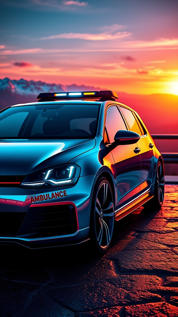 A VW Golf car designed in a futuristic robot style with an ambulance emblem, set against a panoramic view of a mountainous landscape. The scene is illuminated by vibrant neon hues, casting a dazzling interplay of light and shadow across the metallic surfaces of the car. The detailed and high-resolution depiction reveals intricate robotic features, capturing the sunlight that glints off the polished exterior, creating an 8k visual masterpiece.