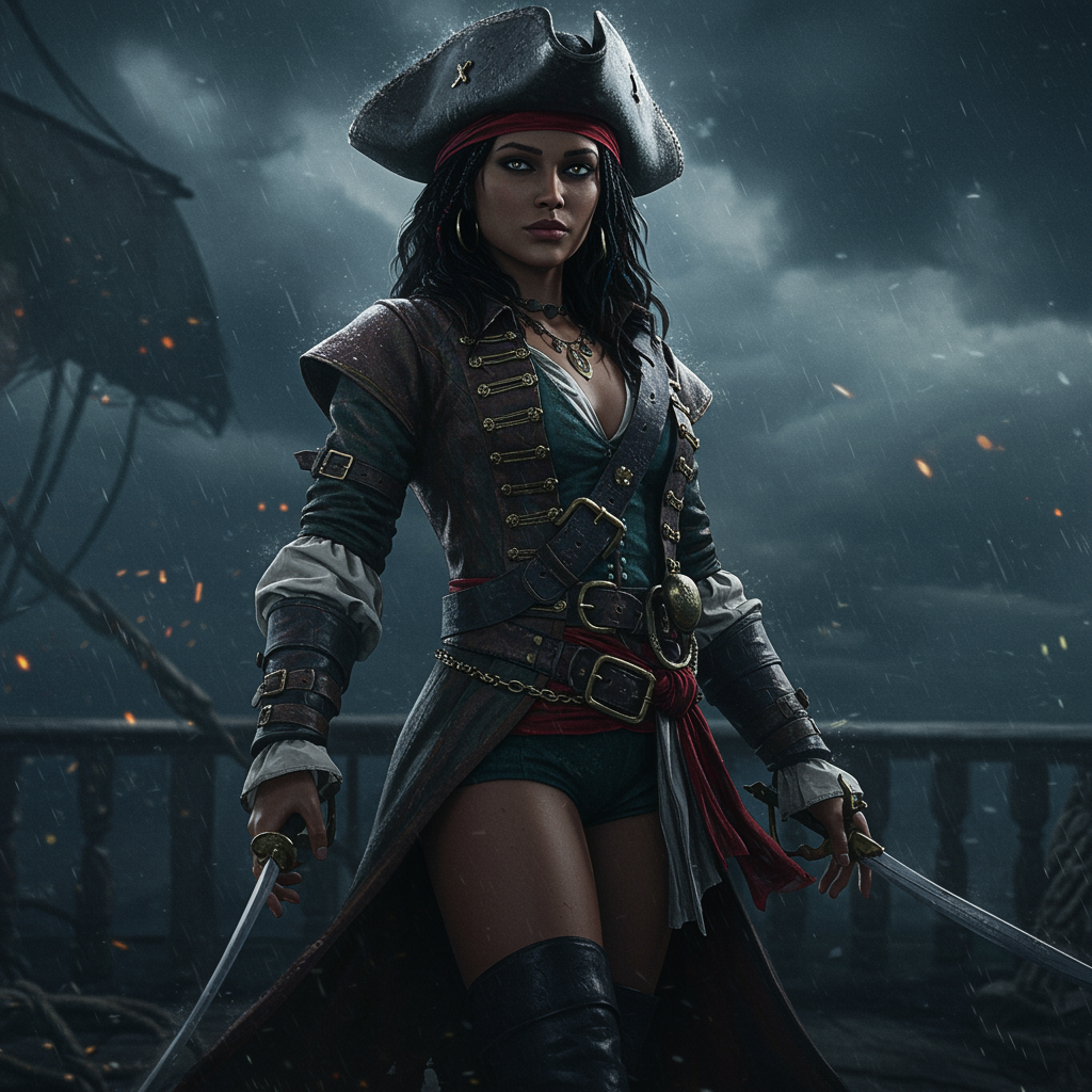 A waist-length body shot of a mysterious lady pirate set against a tumultuous, stormy background. The scene is dense with atmosphere, capturing the wet, dark, and eerie feel of the moment. Her light brown skin glows with a Middle Eastern allure, embodying a femme fatale essence. She dons a finely detailed pirate outfit adorned with intricate accessories, adding to her enigma. The photorealistic render employs cinematic noise, dramatic photography lighting, and depth of field that emphasizes her presence. Real shadows from the dramatic light enhance the movie-quality rendering, with VFX post-production and RTX tracing lighting creating a lifelike scene that captivates the viewer.