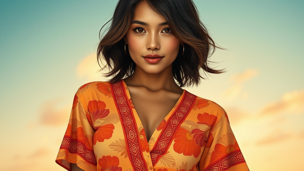 A waist-up portrait of a stunning woman wearing a Pe'a gown, a variation of the holok with an elegantly fitted bodice and a gracefully flared skirt, embellished with intricate Polynesian patterns. Her natural, sun-kissed complexion radiates warmth, while her stylish layered bob hairstyle frames her face with an air of sophistication. She possesses a slender yet curvaceous figure, complemented by a quilt-inspired shirt that adds a touch of artistic flair. The entire image is rendered in a style reminiscent of Anne Bachelier, with a dreamlike quality and rich, vivid colors that evoke a sense of timeless beauty and grace.