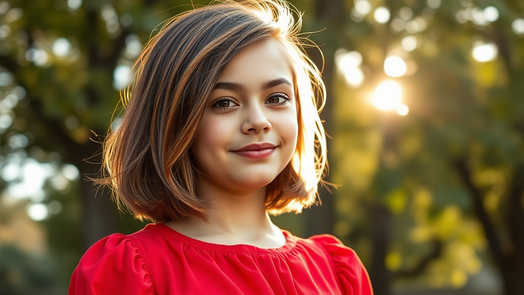 A waist-up portrait of a stunning young girl of diverse heritage, with a glowing natural complexion and a playful medium bob hairstyle in a rich brunette shade accented by sun-kissed blonde highlights. She wears a vibrant red blouse paired with chic black jeans, exuding effortless style against a lush outdoor backdrop, where the golden light filters through the trees, casting a warm glow around her.