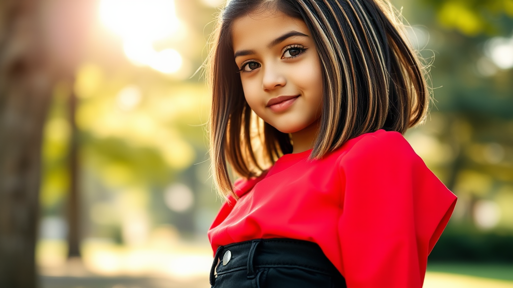 A waist-up portrait of a young beautiful girl of mixed race, soft natural skin with a radiant glow, a medium bob hairstyle that elegantly frames her face, brunette hair interwoven with subtle blonde highlights, wearing a vibrant red blouse paired with classic black jeans, set against a serene outdoor background with gentle sunlight filtering through the trees.