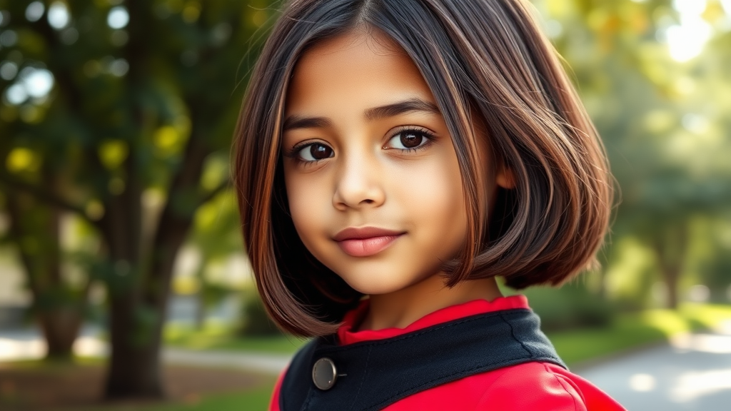 A waist-up portrait of a young, stunning girl of mixed heritage with radiant, smooth skin, and a medium bob hairstyle featuring rich brunette tones with subtle caramel highlights. She's wearing a vibrant red blouse paired with stylish black jeans, set against a serene outdoor background with lush greenery, soft sunlight filtering through the trees, adding a warm, natural glow to the scene.