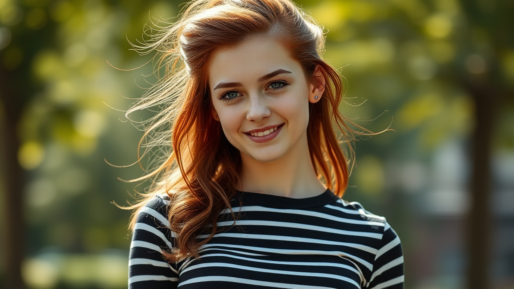 A waist-up portrait of a young stunning girl of Spanish, Italian, or Irish descent, showcasing clear skin and a slim yet curvaceous figure. She is wearing a long-sleeved black and white striped shirt, with her hair styled in an elegant beehive featuring reddish auburn highlights. The setting is outdoors, bathed in natural light that complements her striking features, captured in the iconic fashion style reminiscent of Mario Testino's work. Subtle creative flourishes, such as a gentle breeze lifting the ends of her hair and a slightly mischievous smile, add a lively touch to the scene.