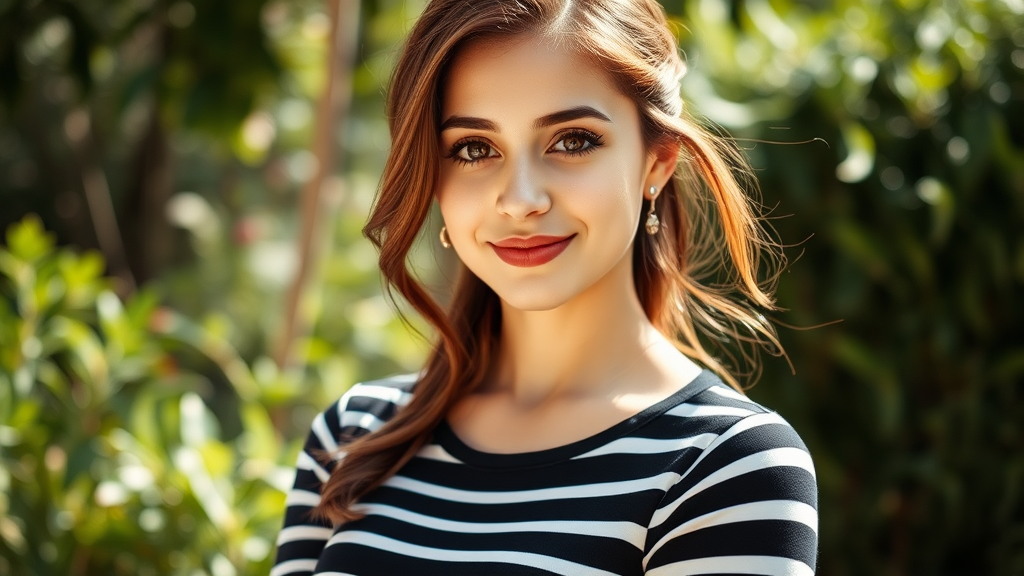 A waist-up portrait of a young, stunning Spanish girl, with smooth, fair skin, slim but with alluring curves, wearing a long-sleeve black and white striped shirt. Her hair flows in an elegant, beehive-inspired style, featuring chestnut brown highlights that catch the light beautifully. She stands in a sunlit outdoor garden, with lush greenery in the background, captured in a sophisticated, vibrant style reminiscent of Mario Testino. Her captivating gaze and gentle smile exude confidence and warmth.