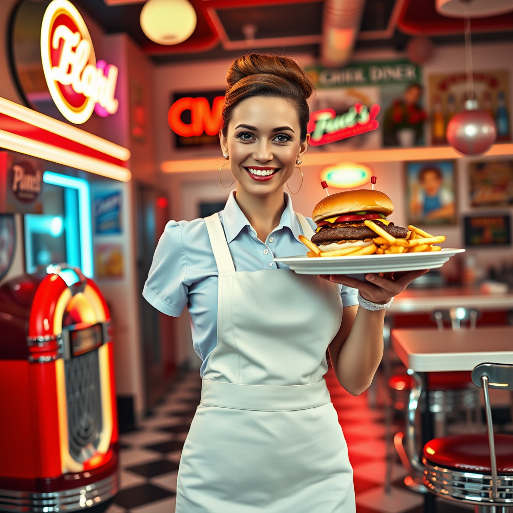 A waitress balancing a tray of food in a retro 1980s diner, captured in hyper-realistic, photo-quality detail. The setting vibrantly reflects the era with neon lights and checkered floors. Her uniform is a classic pastel with a crisp white apron, and she's carrying a plate of burger and fries. The studio photoshoot captures her warm smile and focused expression with a sharp depth of field, accentuating her surroundings—a jukebox, vintage posters, and chrome barstools. The scene exudes nostalgia with touches of contemporary warmth and detail.