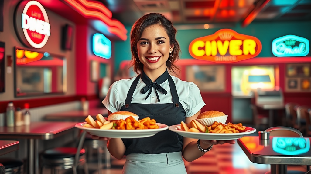 A waitress in a retro 1980s-style diner, carrying plates of classic comfort food, captured with hyper-realistic and photo-realistic detail in high resolution. The scene mimics a studio photoshoot with a shallow depth of field, highlighting her cheerful expression and the vibrant colors of the diner's neon signs and vintage decor. Soft ambient lighting casts subtle reflections on the polished chrome and checkered floor, adding depth and authenticity to the nostalgic atmosphere.