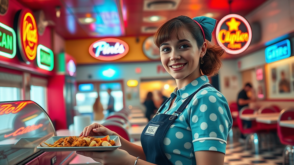 A waitress wearing retro attire serves food in a vibrant 1980s-themed diner, with neon signs and checkered floors, captured in hyper-realistic, high-resolution quality, resembling a studio photoshoot with exceptional depth of field. The scene exudes a nostalgic ambiance, with the diner bustling lightly in the background, creating a lively yet focused snapshot of the waitress in action. Her expression is friendly and approachable, embodying the charm of a bygone era.