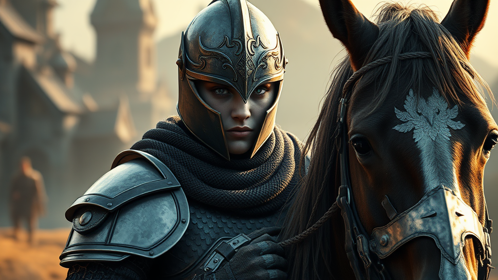 A wandering knight clad in full armor journeys through a medieval fantasy realm, captured in stunning digital artistry. The scene is intricately detailed, a masterpiece of RPG ambiance, showcasing cinematic lighting that accentuates the medieval setting. With a blending of masculine and feminine features, the knight's visage displays an enigmatic allure, their eyes mysteriously duplicated yet compelling. Their hands, holding the reins of a majestic horse, show a curious mutation of extra fingers, lending an otherworldly quality to the composition. Though the image bears slight imperfections like low resolution and subtle jpeg artifacts, it remains a captivating depiction of a lone adventurer in a mystical land, adorned with a grand helmet, evoking epic tales of old.