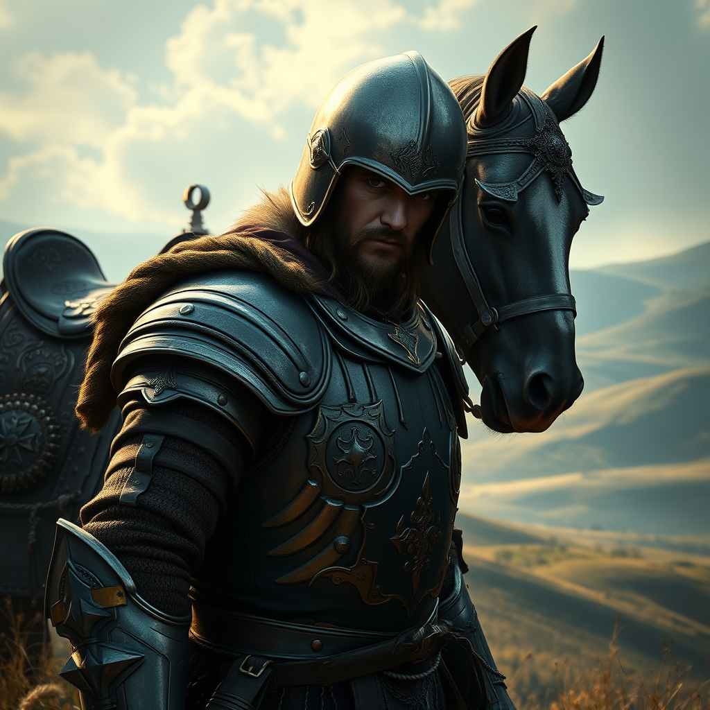 A wandering knight in a medieval fantasy setting, depicted in digital art with intricate, highly detailed features reminiscent of a masterpiece. The scene captures a lone warrior in full armor, with a backdrop of a rich, medieval ambiance. The knight appears masculine, clad in elaborate armor, and stands with posture suggesting readiness for an RPG adventure. There is an emphasis on cinematic lighting to enhance the epic feel of the piece. Beside the knight is a noble horse, intricately detailed with ornate saddle and barding. The knight's helmet reflects the light, adding to the overall mystique of the figure. The landscape is picturesque, with rolling hills in the distance, conveying a sense of winding journey. The knight’s visage, though mostly obscured, hints at a weathered yet determined demeanor. Despite the masculine presence, there are subtle, artistic flourishes suggesting a softer, more nuanced character without overtly feminine traits. The digital medium captures the texture of metal and leather with precision, offering an immersive visual experience.