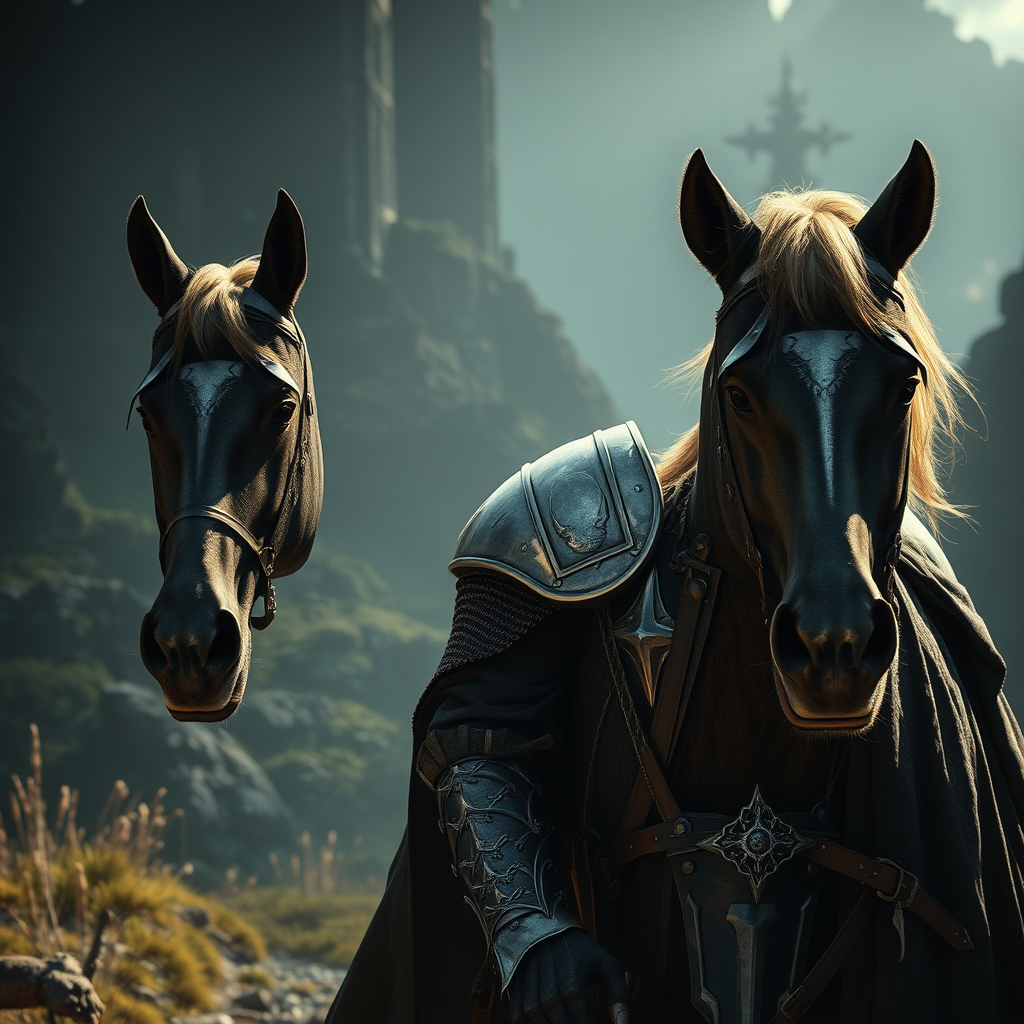 A wandering knight roams through a mystical medieval landscape, captured in a stunning digital artwork. The scene is highly detailed, resembling a masterpiece from an epic RPG game, and features the knight clad in full armor, exuding a sense of nobility and determination. The cinematic lighting casts dramatic shadows, enhancing the medieval ambiance. The knight's features hint at dual identities, with captivating yet slightly unusual eyes. Their hands bear traces of an ancient curse, subtly altered yet strong and capable. Beside the knight stands a noble horse, a steadfast companion on this quest. Though the knight wears a helmet, a touch of feminine grace suggests an intriguing backstory. The artwork is crisply detailed, free from any low resolution or visual imperfections, drawing viewers into its enchanting world.