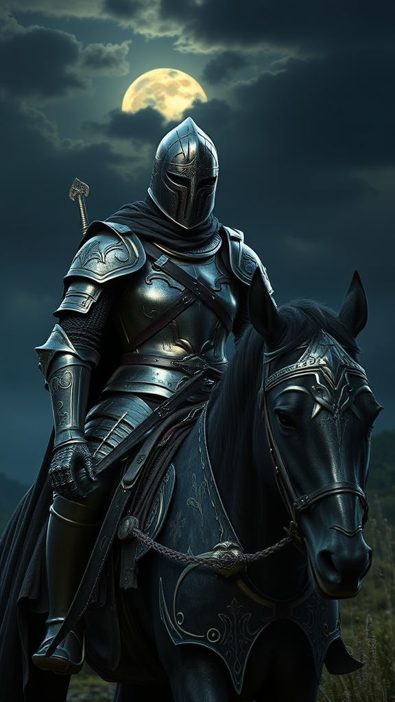 A wandering knight traverses a mystical landscape, clad in full, intricately detailed medieval armor, embodying the essence of a fantasy RPG character. This lone warrior is captured in digital art form, showcasing a masterpiece of intricate design with cinematic lighting that highlights the medieval ambiance. The knight stands resolute, a powerful presence under a dimly lit sky. Their armor glistens with the subtle elegance of craftsmanship, while they ride a noble steed that complements their formidable stature. A distinguished helmet obscures their features, hinting at hidden tales and secrets. Despite some unusual features like an extra set of eyes and uniquely formed hands that add an otherworldly quality to the scene, the overall composition remains breathtaking. The atmosphere echoes romance and adventure, inviting viewers into a richly imagined world where a feminine yet valiant presence defies norms and embarks on epic quests.