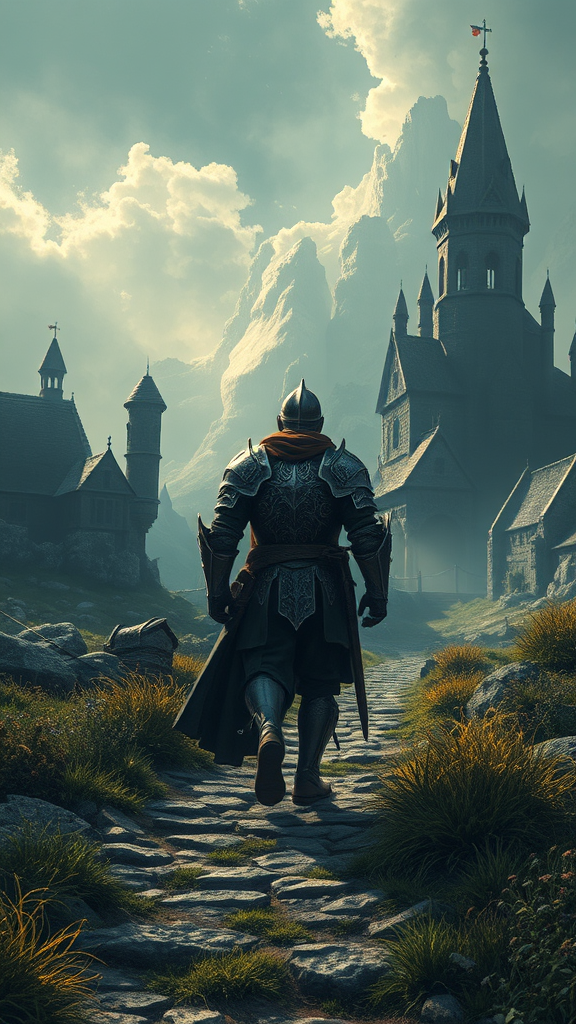 A wandering knight traverses a mystical medieval landscape, set amidst a fantasy realm, intricately detailed with masterful artistry. The digital art captures the essence of an RPG, with cinematic lighting casting dramatic shadows and highlighting the knight's ornate armor. The medieval ambiance envelops the scene, inviting viewers into a world of adventure and chivalry.