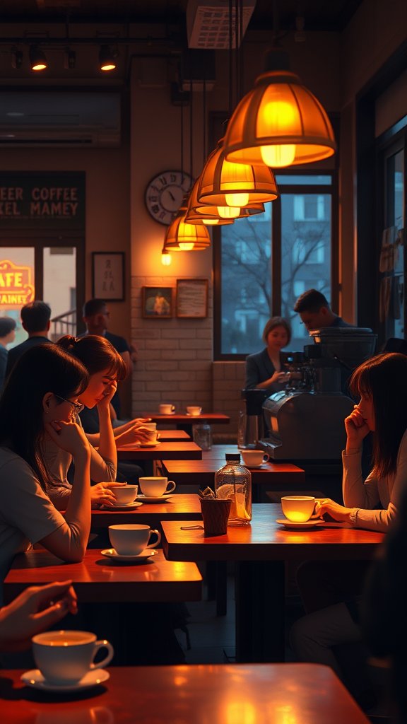 A warm and inviting café setting in the evening, filled with young people savoring coffee, each table illuminated by soft, cinematic lighting. The scene captures a barista skillfully operating at the counter, surrounded by an ethereal glow. Rendered in digital art, the scene possesses intricate hand-drawn details combined with the realism of octane render techniques. The ambience is atmospheric and slightly dark, offering a cozy yet elegant atmosphere with ultra-detailed 4K visuals. The focus is sharp, with a touch of humor in the illustration style, and the depth of field provides a masterful composition. Colors are vivid and saturated, creating a hyperrealistic model-shoot atmosphere, reminiscent of professional oil paintings by Ed Blinkey and Studio Ghibli animators, among others. The piece echoes the styles trending on ArtStation and CGSociety, with high detail and an intricate, dramatic flair. The café's interior is alive with vibrant energy and a sense of community, all depicted in a photorealistic and cinematic manner.