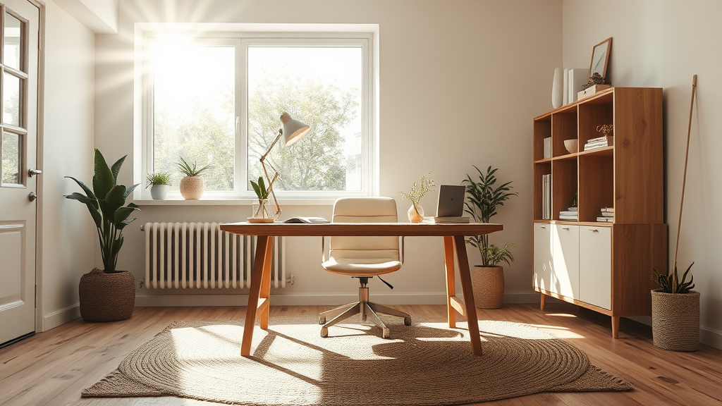 A warm and inviting Scandinavian home office featuring a natural oak desk bathed in the soft glow of ambient lighting. Sunlight streams through a large floor-to-ceiling window, infusing the space with a serene and airy atmosphere. Captured from a low-angle perspective to emphasize the room's spaciousness, the scene highlights intricate details and textures. A plush woven rug and minimalist greenery enhance the cozy vibe, while sleek storage solutions and subtle accents add a touch of modern sophistication. The harmonious blend of studio light and sunlight creates an ultra-realistic setting.