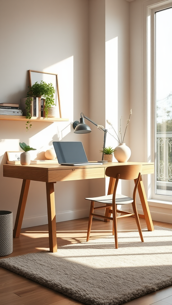 A warm and inviting Scandinavian home office featuring a sleek natural oak desk, illuminated by soft ambient lighting from a large floor-to-ceiling window, captured from a low angle to highlight the room's airy and spacious feel. The ultra-realistic scene is enriched with intricate details, combining studio lighting with the gentle embrace of sunlight. A few cozy touches, such as a plush area rug and a minimalist bookshelf adorned with lush green plants, add charm and personality to the serene workspace.