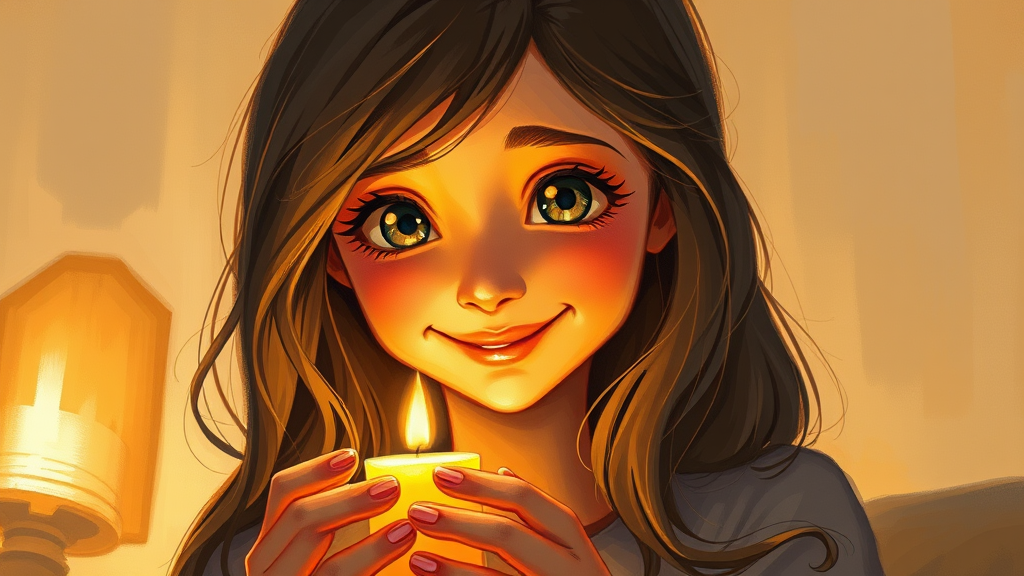 A warm, impressionistic painting of a charming young woman with a gentle smile, her large, expressive eyes captivated by the flickering flame of a candle she cradles tenderly in her hands. Her soft hair cascades around her face, casting subtle shadows on her delicate features. The glow from the candle bathes her in a comforting, golden light, creating a serene and intimate atmosphere. In the background, abstract shapes suggest a cozy, softly illuminated space, enhancing the peaceful ambiance of the scene.
