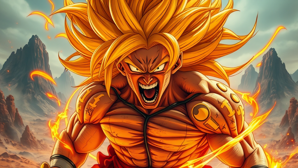 A warrior character with Goku-like features, depicted in a close-up portrait with extraordinarily long yellow hair, engaged in a fierce battle. His face is contorted in extreme rage as he descends into a berserk state, mouth open in a primal scream, surrounded by a swirling mass of charging energy. His body is scarred, dirty, and shows signs of injury, all contributing to a serious, intense mood. Glowing yellow runes adorn his skin, intertwining with an orange and yellow aura that dances like flames around him. The backdrop is a vast desert landscape with jagged, towering mountains. He's captured in a dynamic, epic action pose, set against a backdrop filled with futuristic glamour and energy. The composition is symmetrical, highlighting his power, with a redshift effect lending an otherworldly glow. The scene is imbued with the stylized drama of DC Comics, complete with spectacular, sharp-edged backdrops, exuding a sense of unstoppable energy and power.