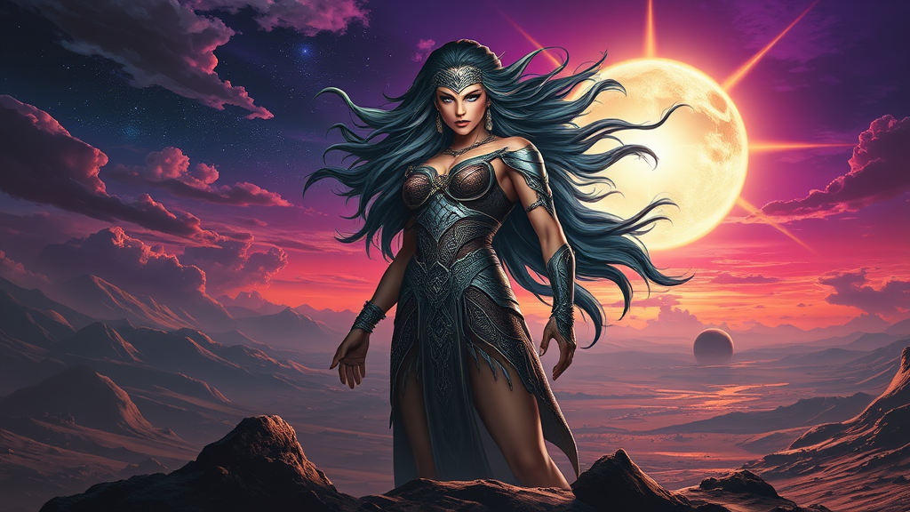 A warrior goddess towers on a barren planet, her physique exuding immense power and strength. Her flowing hair, a mesmerizing blend of black and silver, glimmers in the stellar light. Her face is a perfect balance of beauty and ferocity, adorned with sharp cheekbones, full lips, and piercing blue eyes that feel all-seeing. The sky, a stunning tapestry of deep purples and blues, reflects the radiant glow of the nearby star. The scene is crafted in a hypermaximalist style, where every inch is brimming with intricate details and patterns. The interplay of light and shadow is masterfully executed, with the star's brilliance casting dramatic shadows over the planet's landscape. The artwork is a revolutionary and awe-inspiring masterpiece, free from any imperfections or flaws that might detract from its beauty.